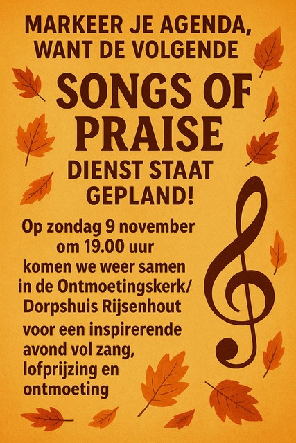 Kom dan naar onze Songs Of Praise meezingdienst op zondag 9 november van 19:00 tot 20:00 uur in de Ontmoetingskerk/Dorpshuis.