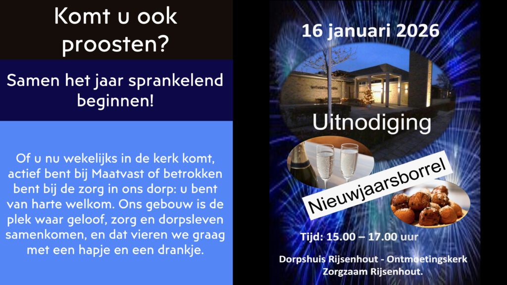 Het nieuwe jaar ligt als een onbeschreven blad voor ons. Een jaar waarin we hopen op mooie ontmoetingen, steun aan elkaar en veel gezelligheid. Om dat jaar goed in te luiden, slaan de PKN Gemeente Rijsenhout, Maatvast en Zorgzaam Rijsenhout de handen ineen voor een feestelijke nieuwjaarsreceptie!